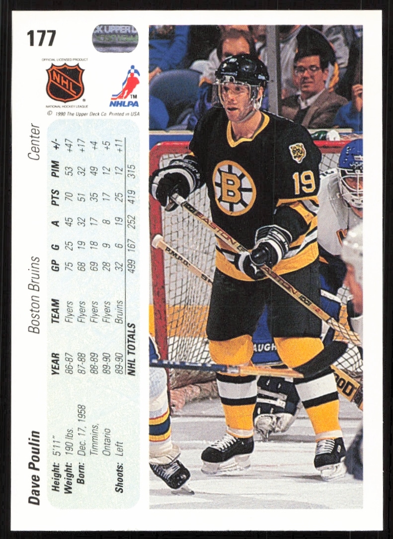 This Hockey card, from 1990-91 is part of the Upper Deck card set. Dave Poulin is featured and has a card number of 177.