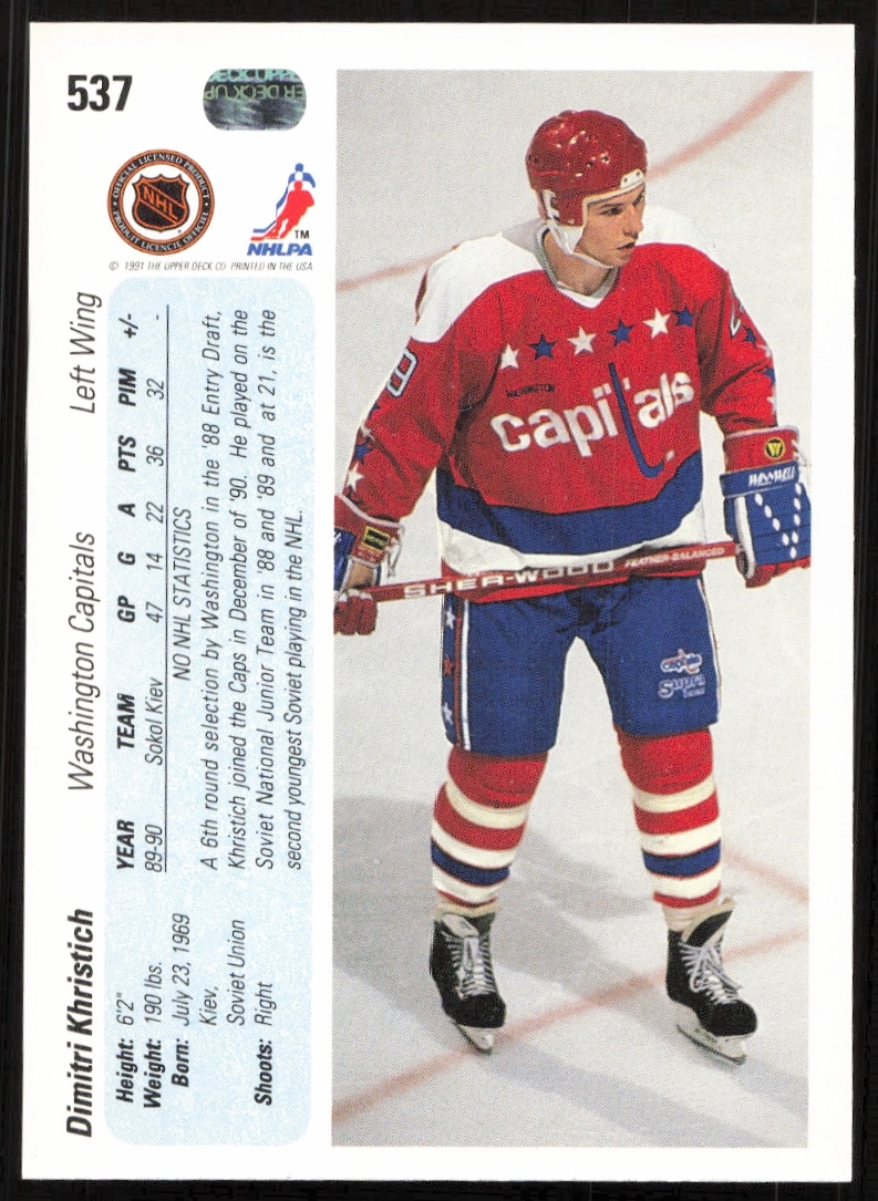 This Hockey card, from 1990-91 is part of the Upper Deck card set. Dmitri Khristich is featured and has a card number of 537.