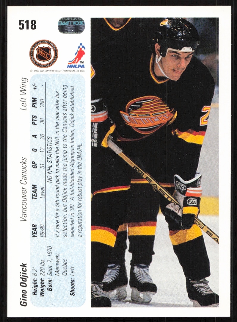 This Hockey card, from 1990-91 is part of the Upper Deck card set. Gino Odjick is featured and has a card number of 518.
