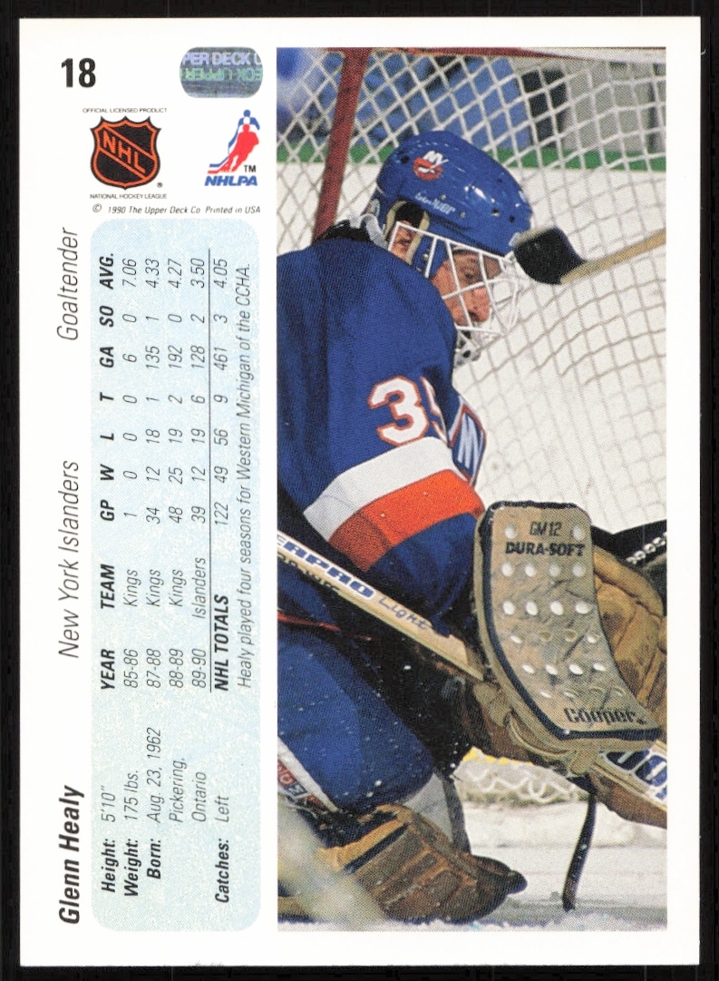 This Hockey card, from 1990-91 is part of the Upper Deck card set. Glenn Healy is featured and has a card number of 18.