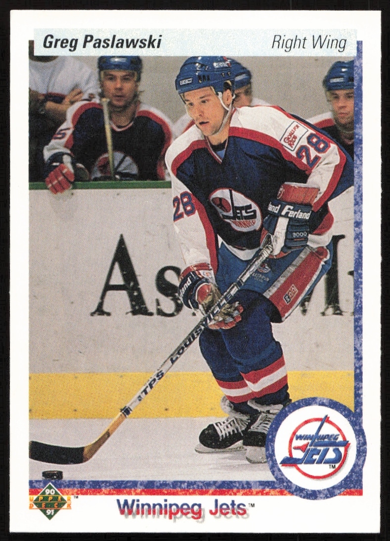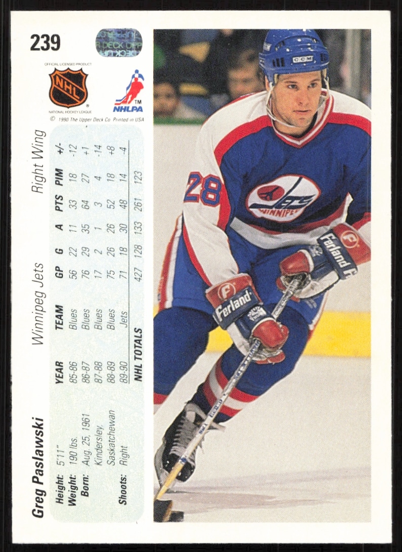 This Hockey card, from 1990-91 is part of the Upper Deck card set. Greg Paslawski is featured and has a card number of 239.