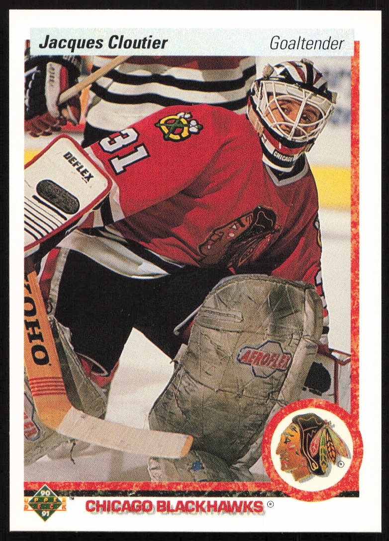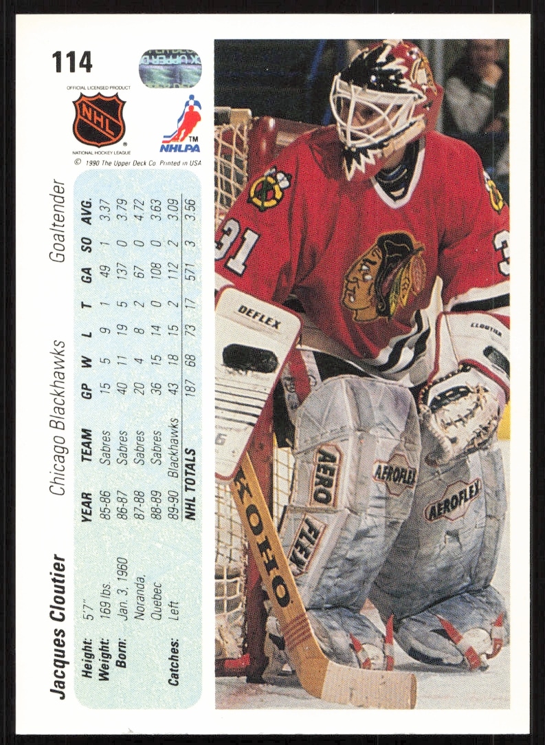 This Hockey card, from 1990-91 is part of the Upper Deck card set. Jacques Cloutier is featured and has a card number of 114.