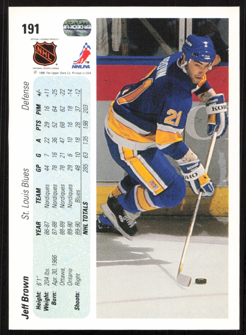 This Hockey card, from 1990-91 is part of the Upper Deck card set. Jeff Brown is featured and has a card number of 191.