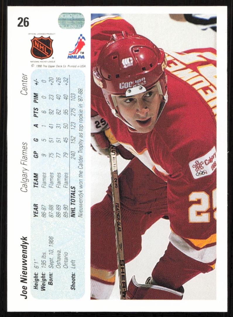 This Hockey card, from 1990-91 is part of the Upper Deck card set. Joe Nieuwendyk is featured and has a card number of 26.