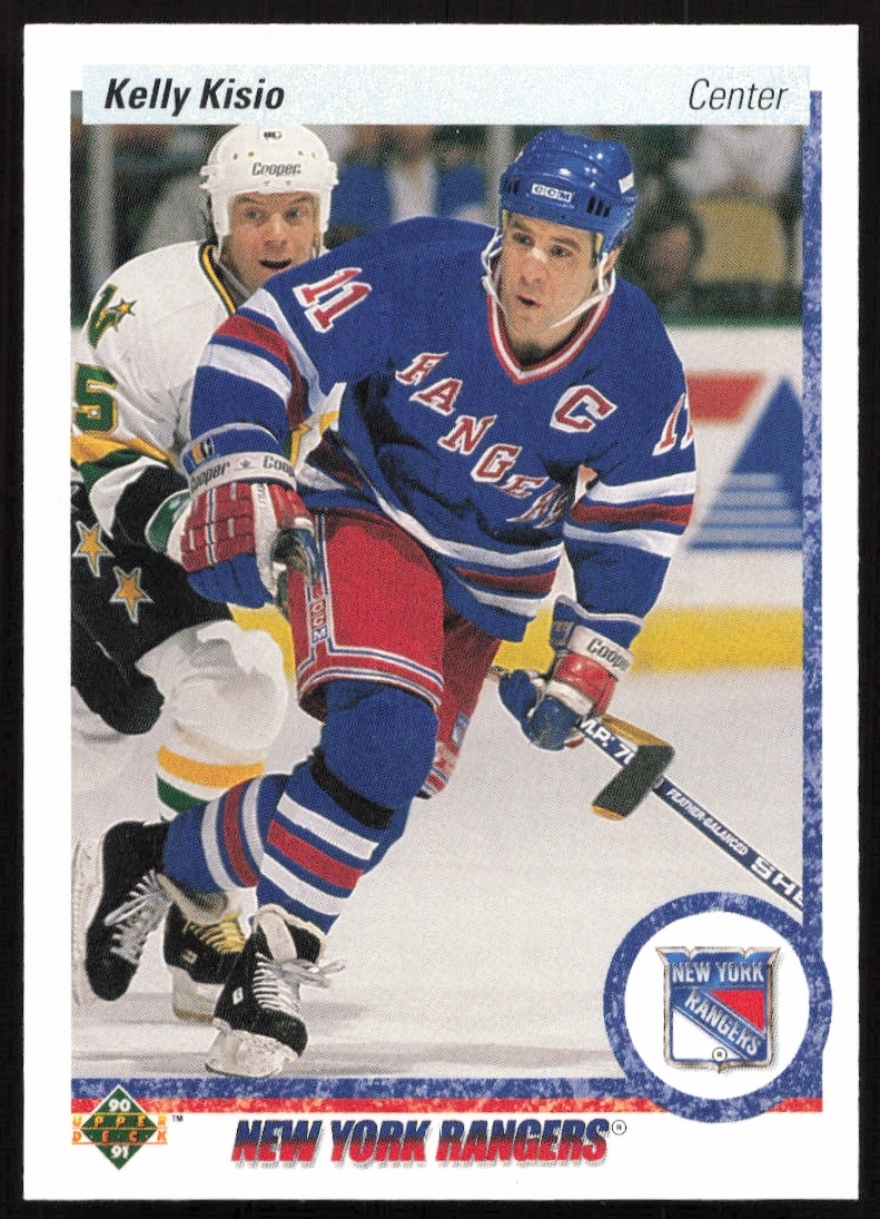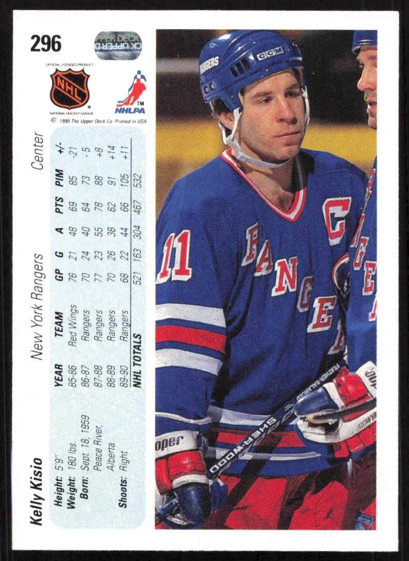 This Hockey card, from 1990-91 is part of the Upper Deck card set. Kelly Kisio is featured and has a card number of 296.