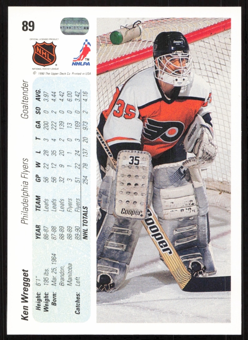 This Hockey card, from 1990-91 is part of the Upper Deck card set. Ken Wregget is featured and has a card number of 89.