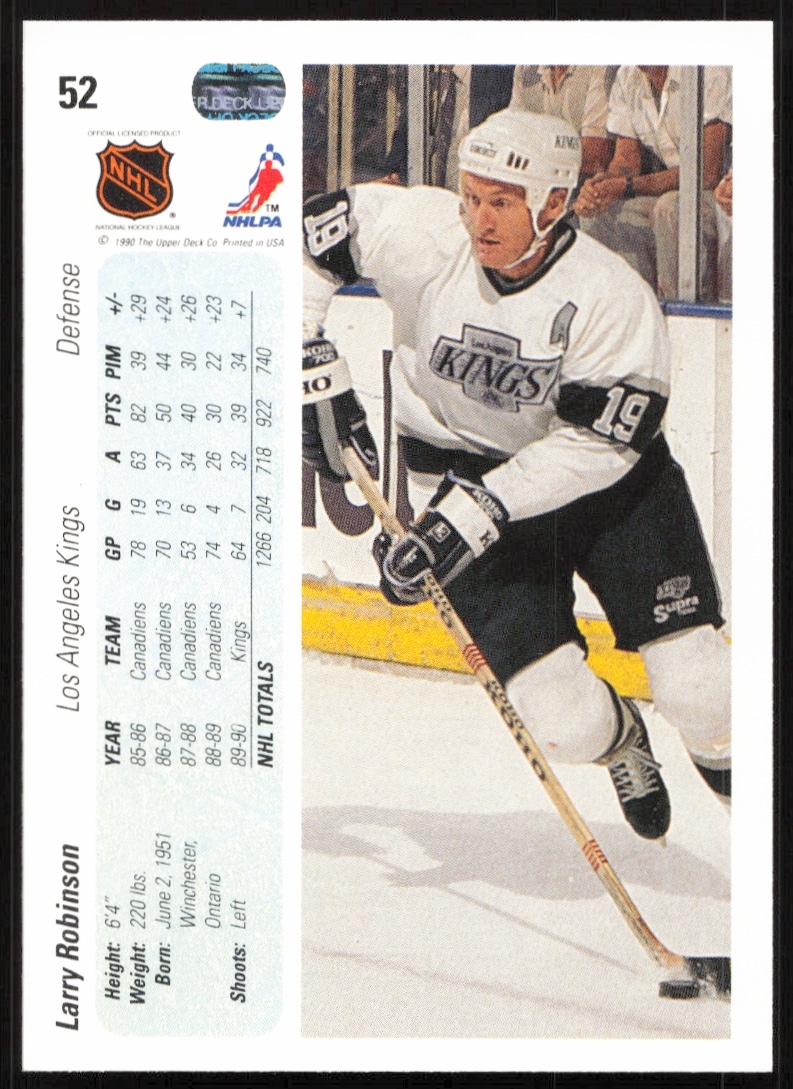This Hockey card, from 1990-91 is part of the Upper Deck card set. Larry Robinson is featured and has a card number of 52.