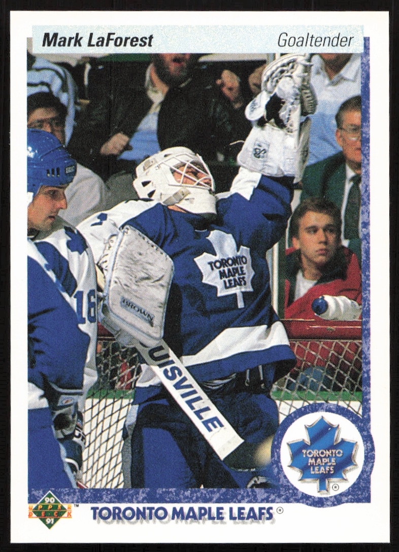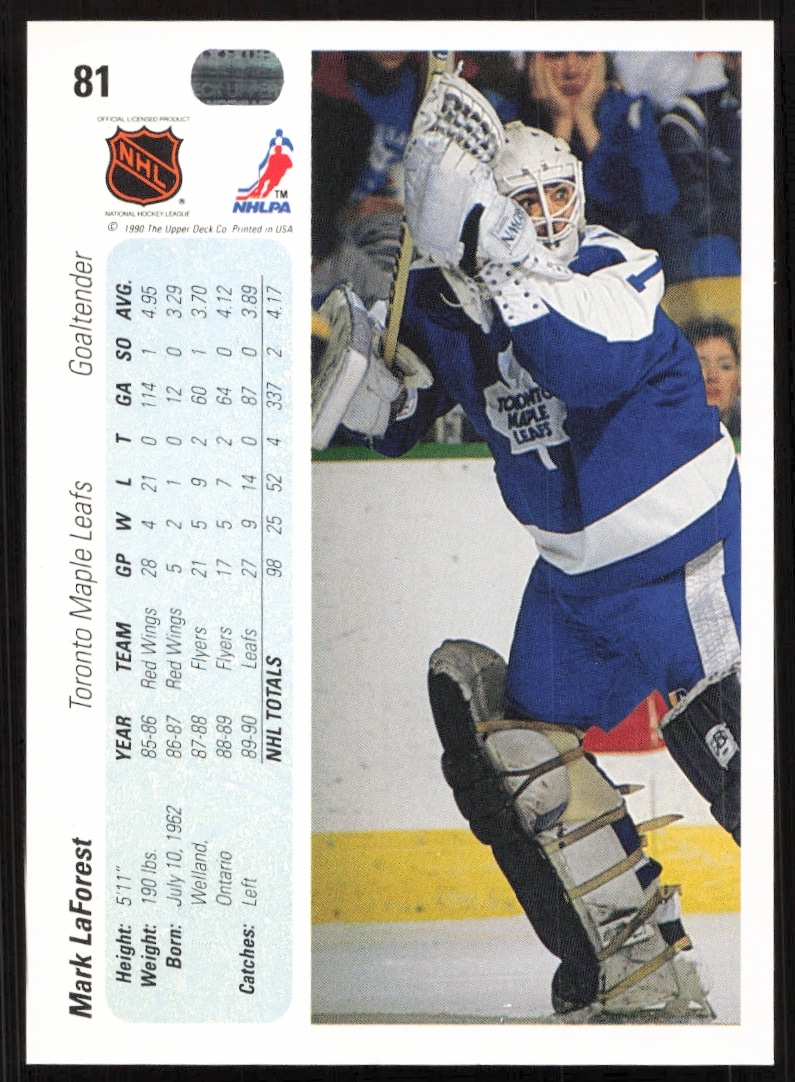 This Hockey card, from 1990-91 is part of the Upper Deck card set. Mark Laforest is featured and has a card number of 81.