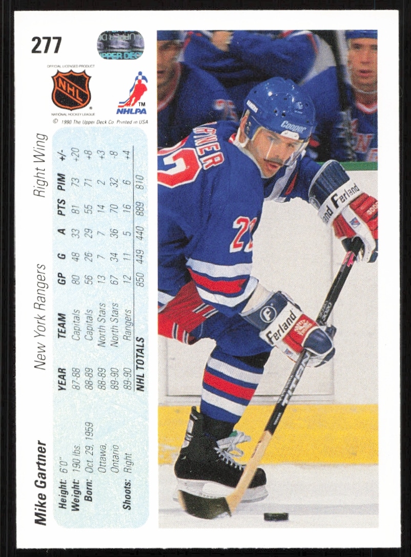 This Hockey card, from 1990-91 is part of the Upper Deck card set. Mike Gartner is featured and has a card number of 277.