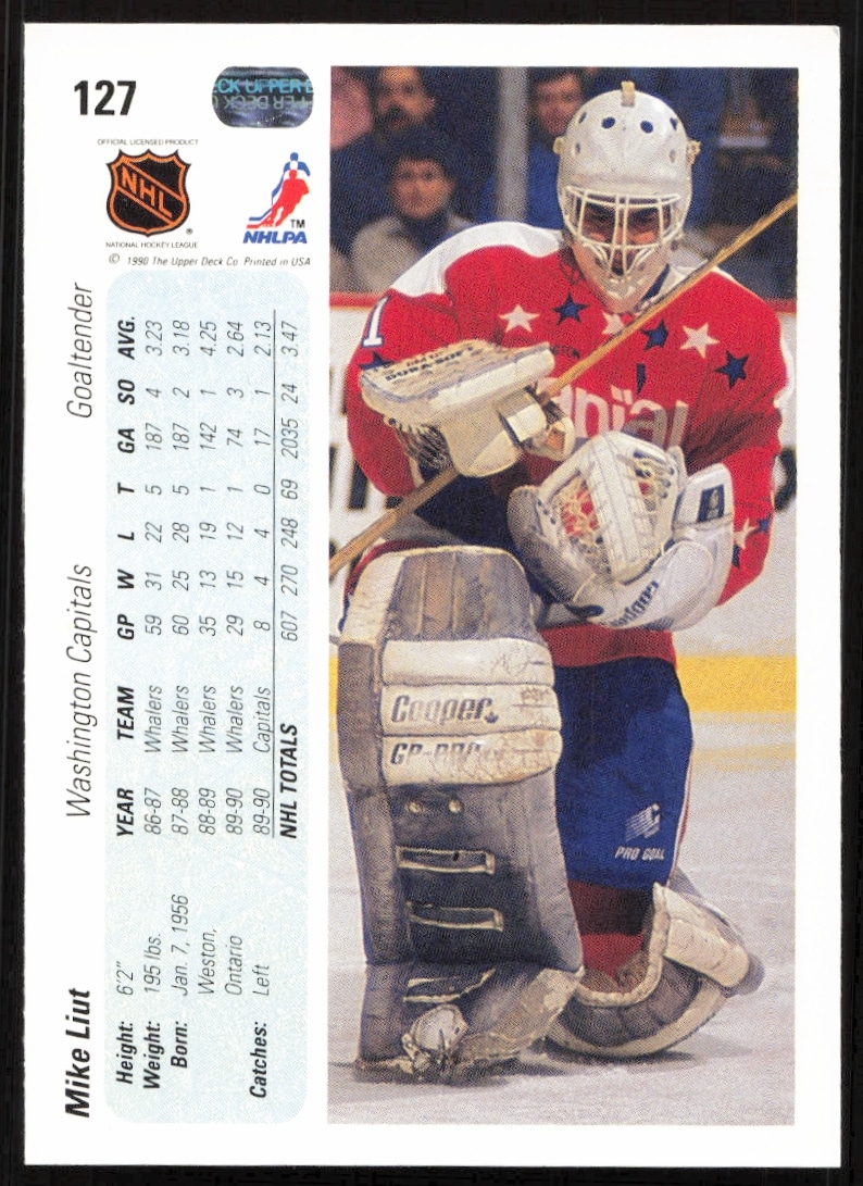 This Hockey card, from 1990-91 is part of the Upper Deck card set. Mike Liut is featured and has a card number of 127.