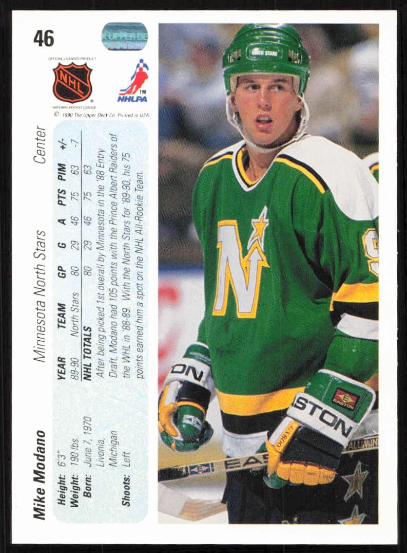 This Hockey card, from 1990-91 is part of the Upper Deck card set. Mike Modano is featured and has a card number of 46.