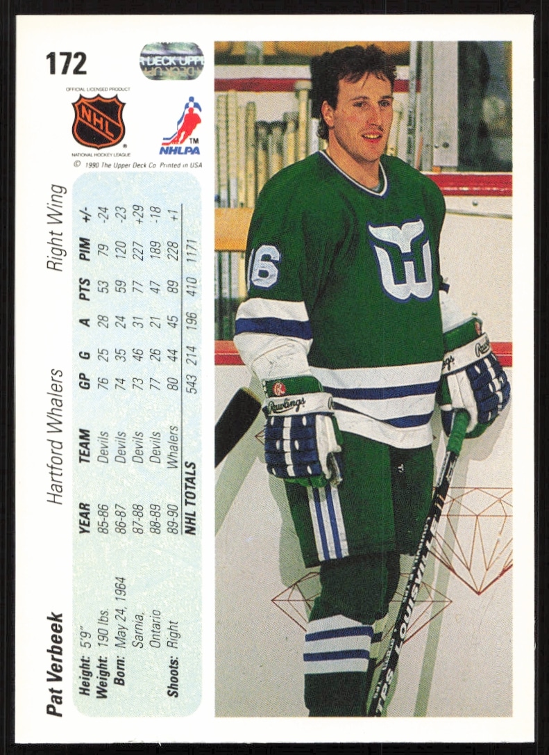 This Hockey card, from 1990-91 is part of the Upper Deck card set. Pat Verbeek is featured and has a card number of 172.