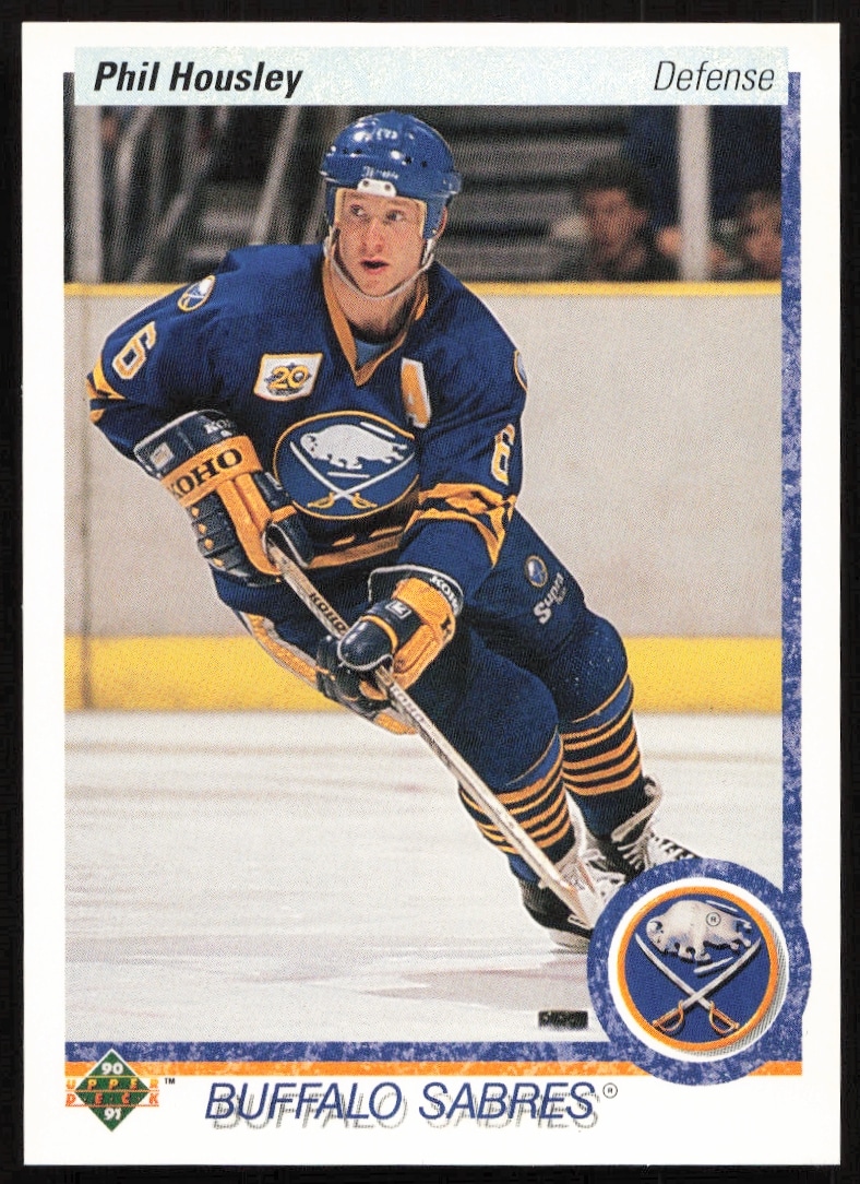 This Hockey card, from 1990-91 is part of the Upper Deck card set. Phil Housley is featured and has a card number of 22.