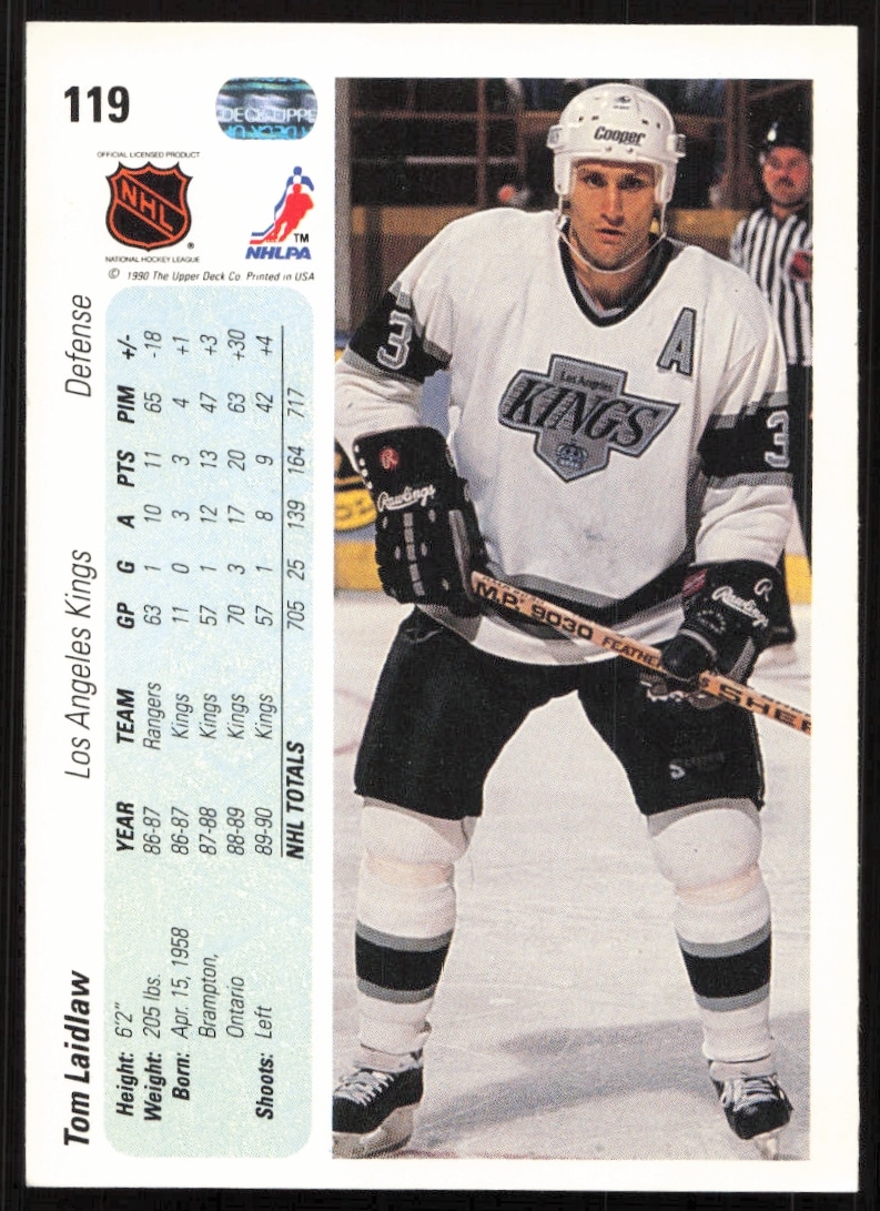 This Hockey card, from 1990-91 is part of the Upper Deck card set. Tom Laidlaw is featured and has a card number of 119.