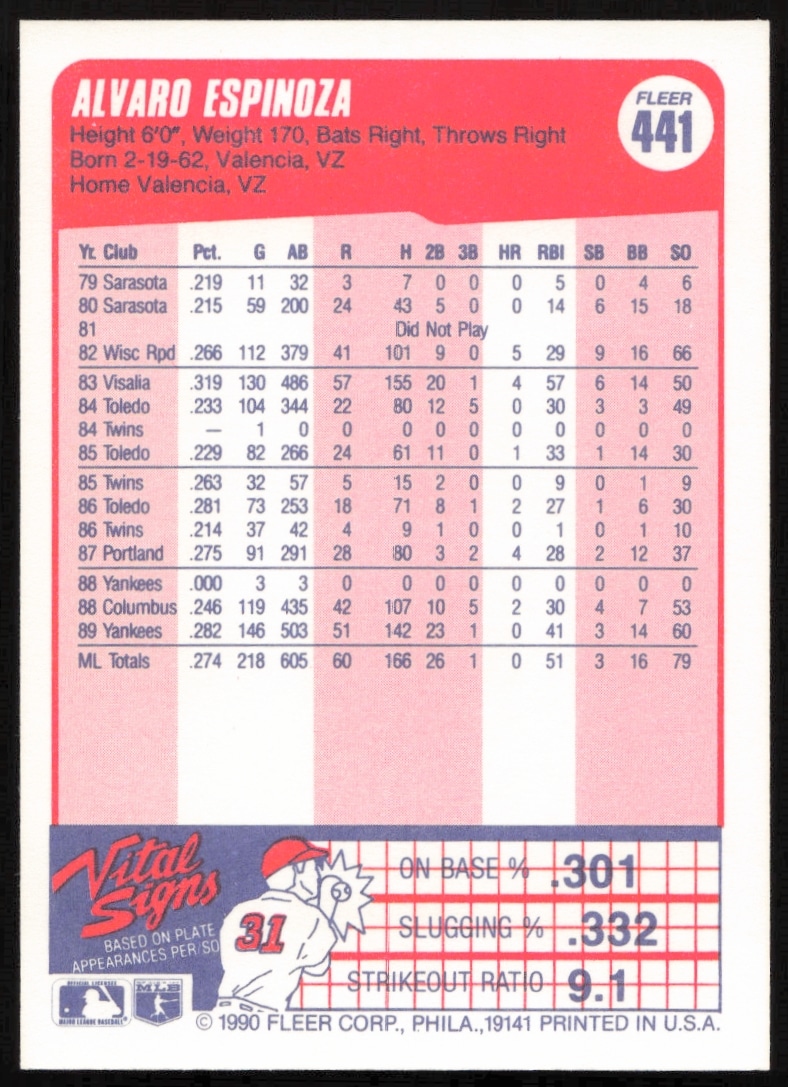 This Baseball card, from 1990 is part of the Fleer card set. Alvaro Espinoza is featured and has a card number of 441.