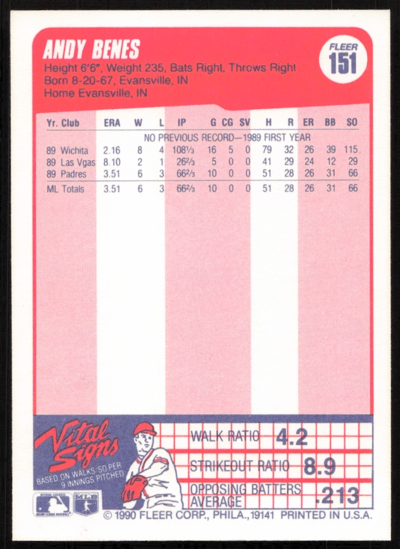 This Baseball card, from 1990 is part of the Fleer card set. Andy Benes is featured and has a card number of 151.