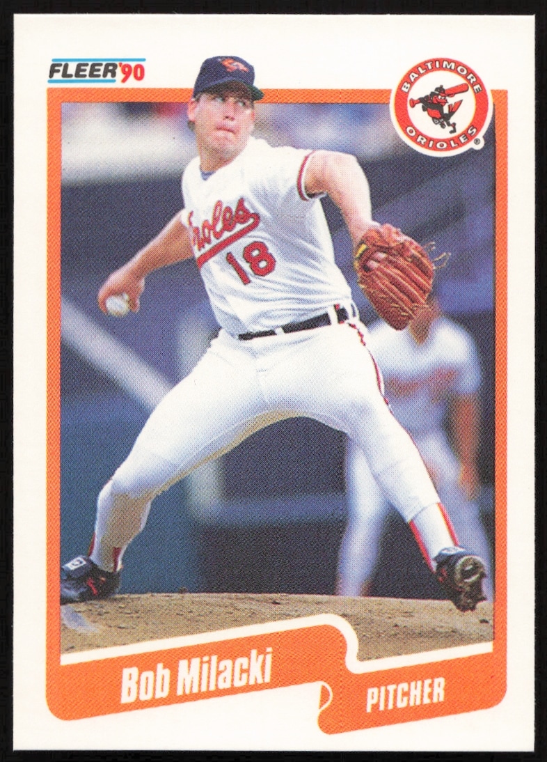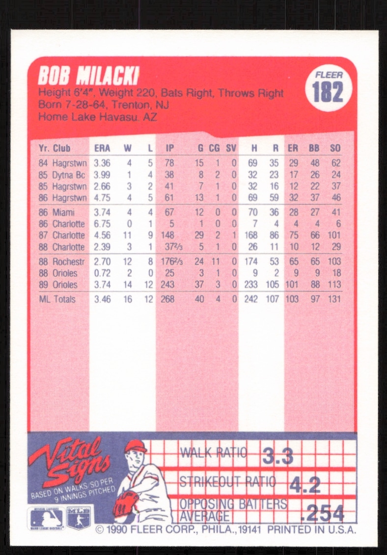 This Baseball card, from 1990 is part of the Fleer card set. Bob Milacki is featured and has a card number of 182.