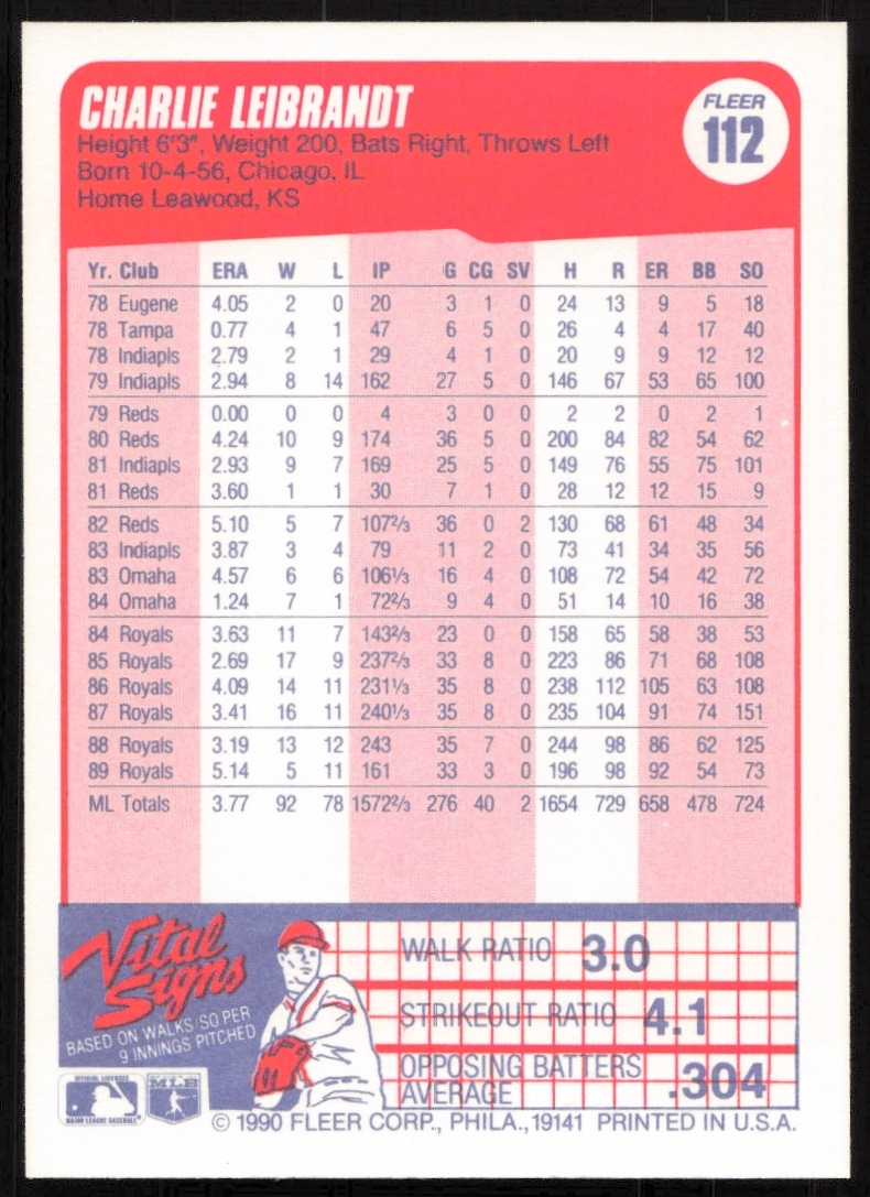 This Baseball card, from 1990 is part of the Fleer card set. Charlie Leibrandt is featured and has a card number of 112.