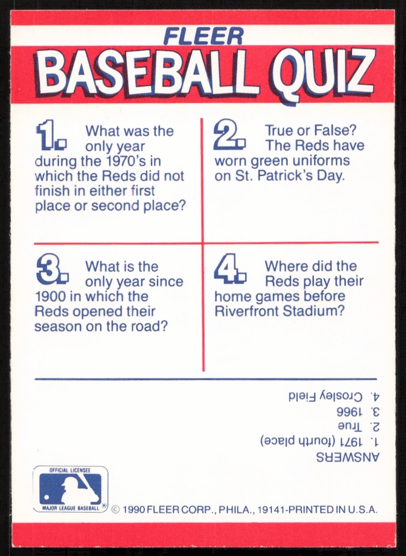 This Baseball card, from 1990 is part of the Fleer card set. Cincinnati Reds is featured and has a card number of .