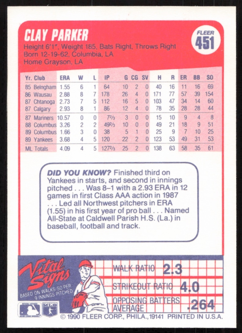 This Baseball card, from 1990 is part of the Fleer card set. Clay Parker is featured and has a card number of 451.