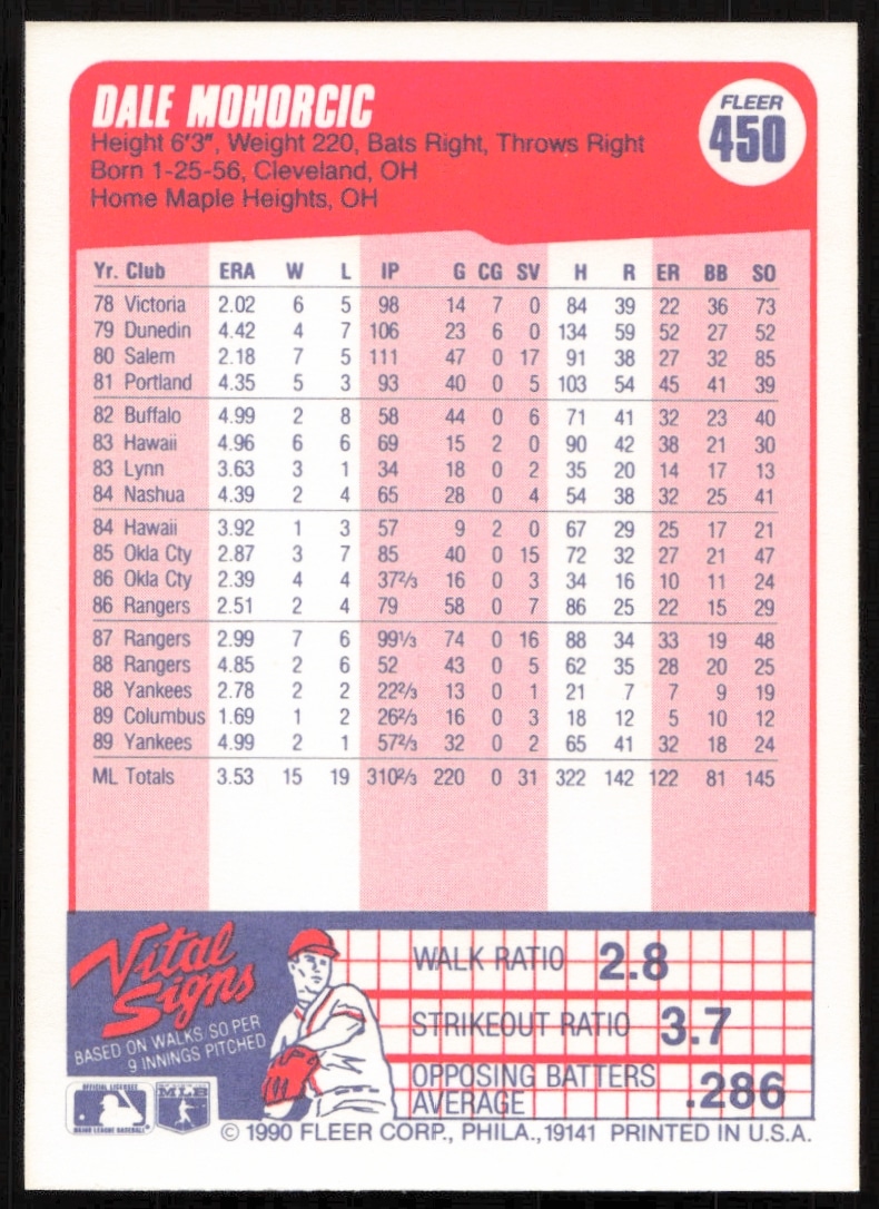 This Baseball card, from 1990 is part of the Fleer card set. Dale Mohorcic is featured and has a card number of 450.