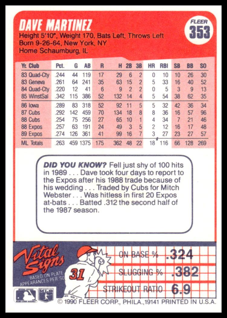 This Baseball card, from 1990 is part of the Fleer  card set. Dave Martinez is featured and has a card number of 353.