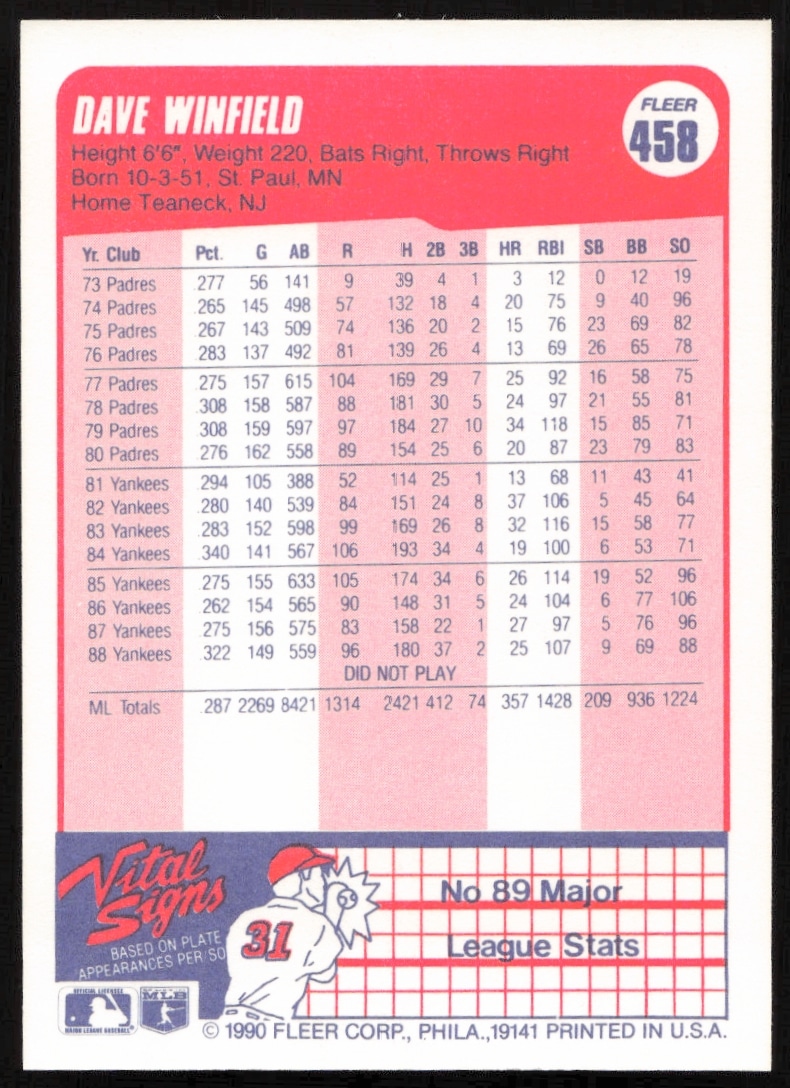This Baseball card, from 1990 is part of the Fleer card set. Dave Winfield is featured and has a card number of 458.