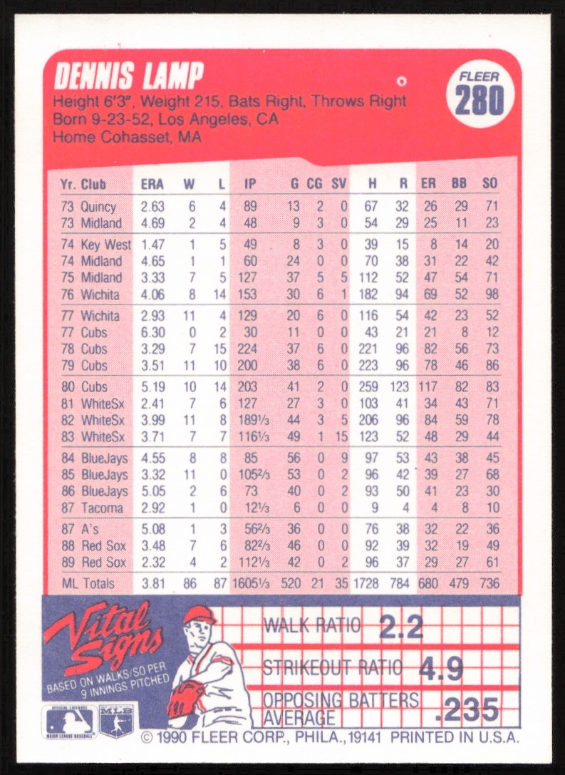 This Baseball card, from 1990 is part of the Fleer card set. Dennis Lamp is featured and has a card number of 280.