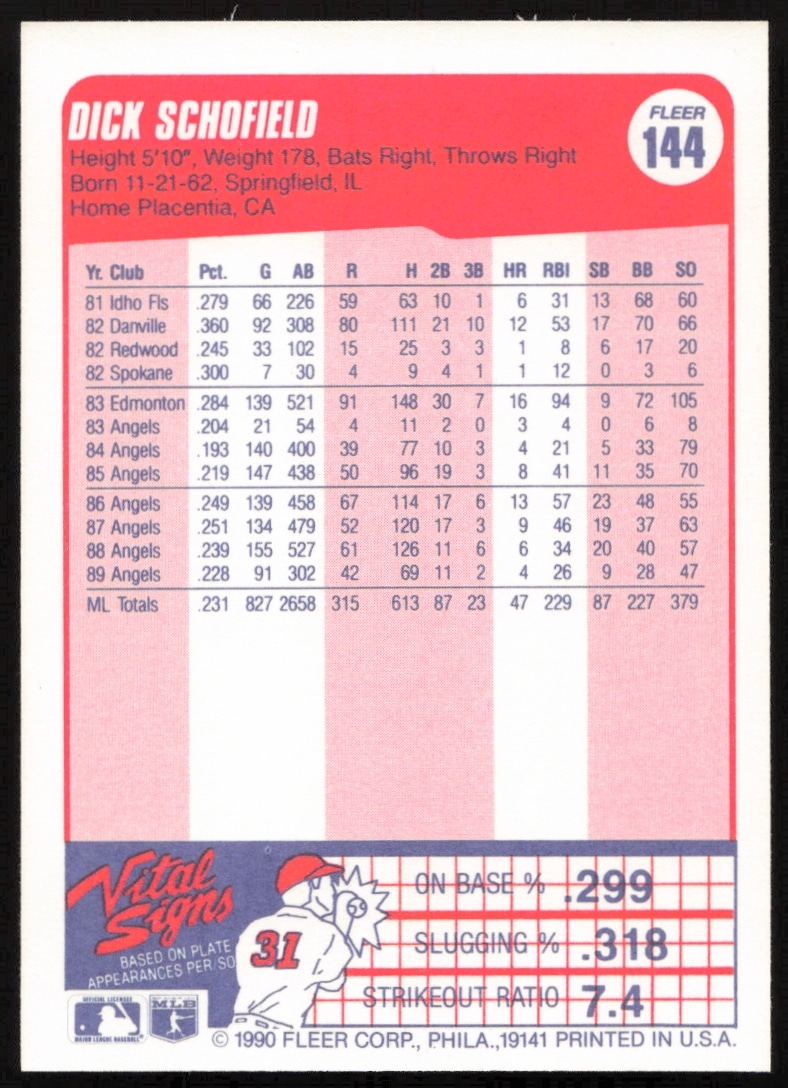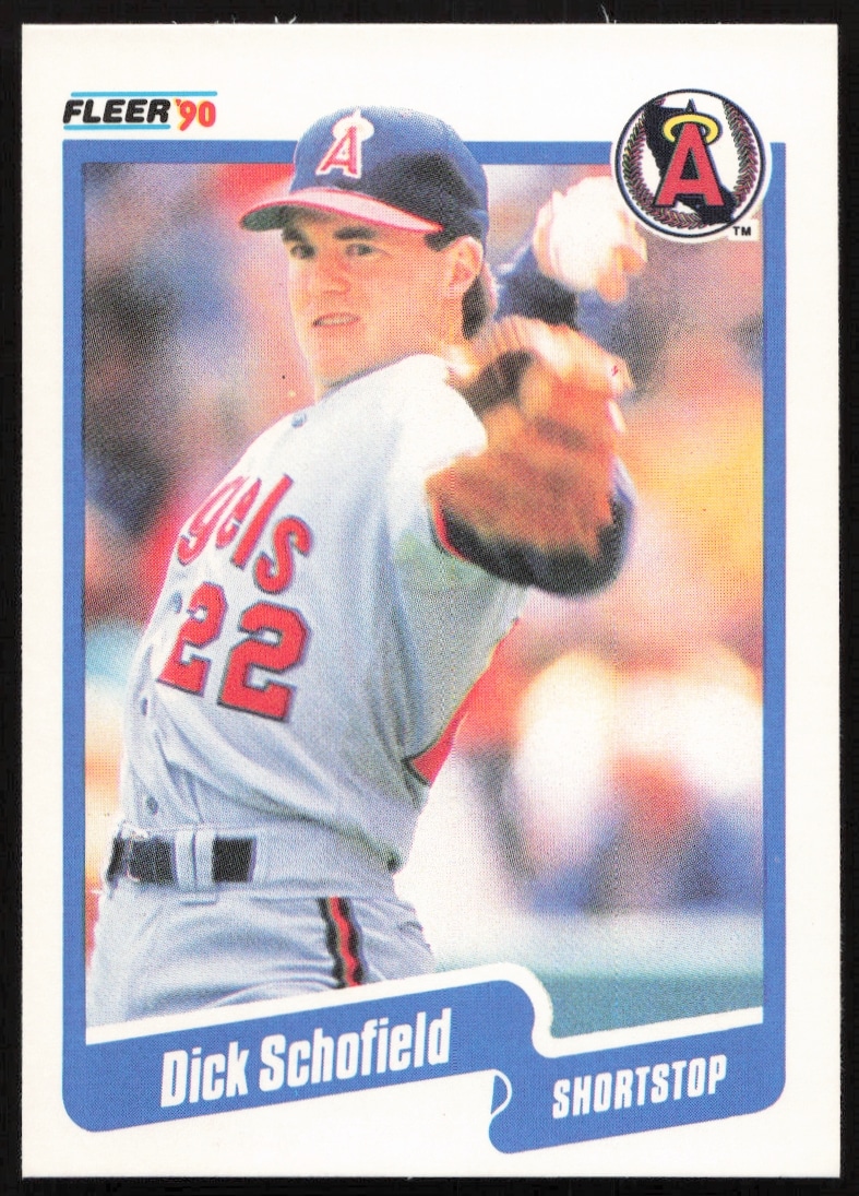This Baseball card, from 1990 is part of the Fleer card set. Dick Schofield is featured and has a card number of 144.