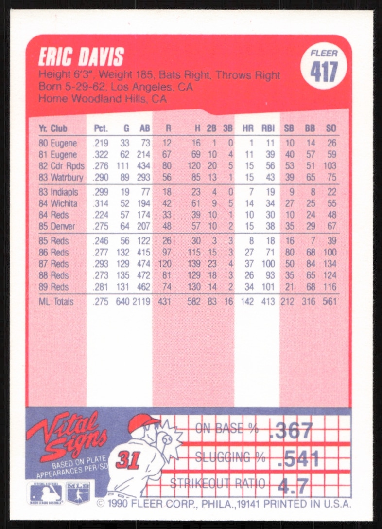 This Baseball card, from 1990 is part of the Fleer card set. Eric Davis is featured and has a card number of 417.