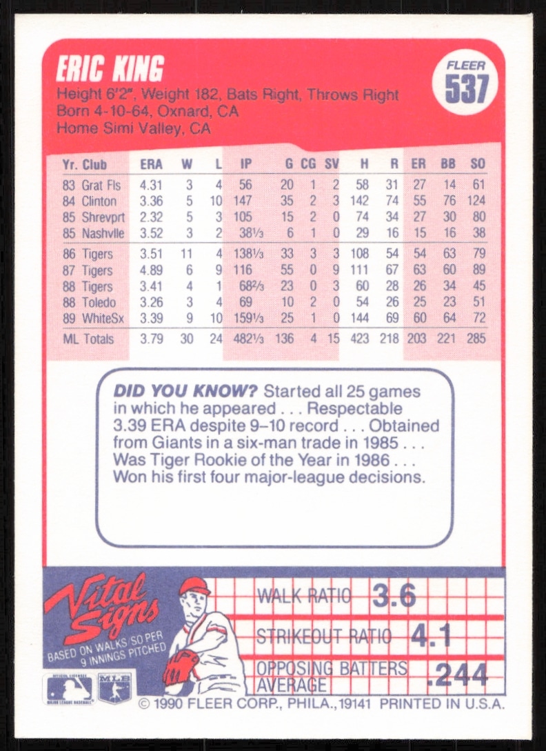 This Baseball card, from 1990 is part of the Fleer card set. Eric King is featured and has a card number of 537.