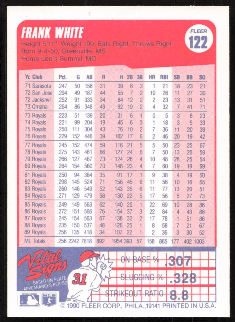 This Baseball card, from 1990 is part of the Fleer card set. Frank White is featured and has a card number of 122.