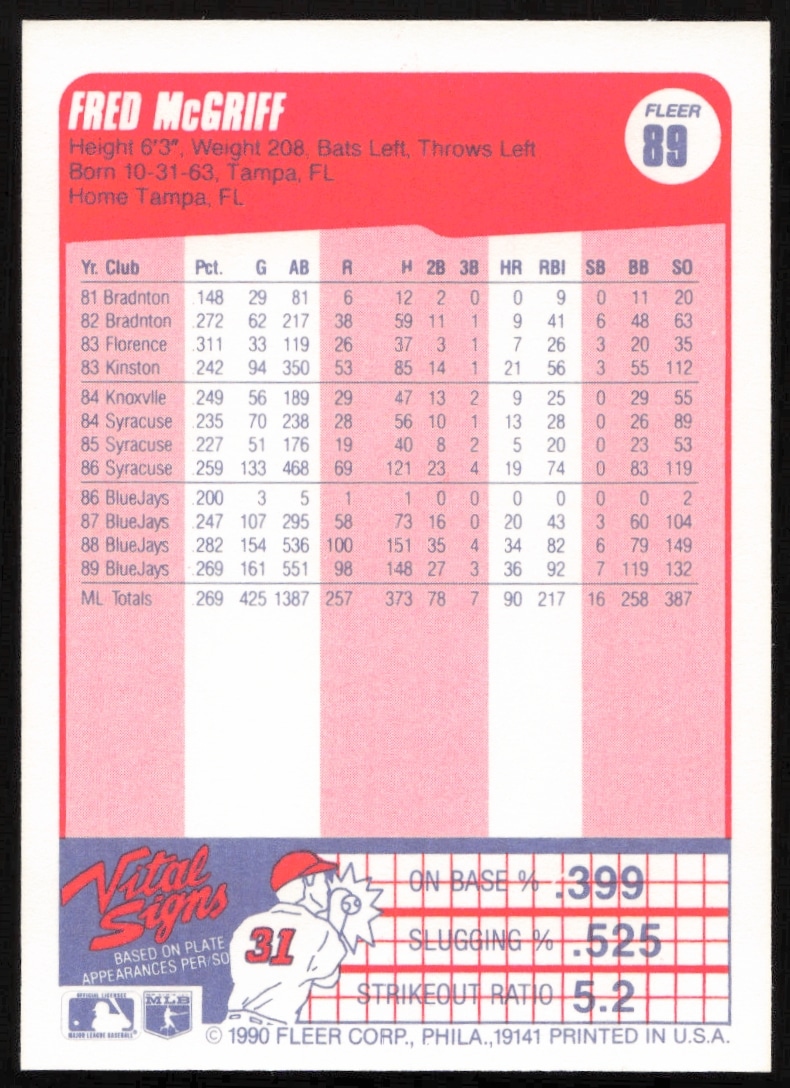This Baseball card, from 1990 is part of the Fleer card set. Fred McGriff is featured and has a card number of 89.