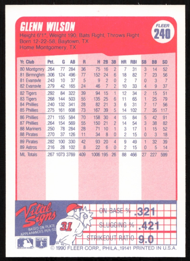 This Baseball card, from 1990 is part of the Fleer card set. Glenn Wilson is featured and has a card number of 240.