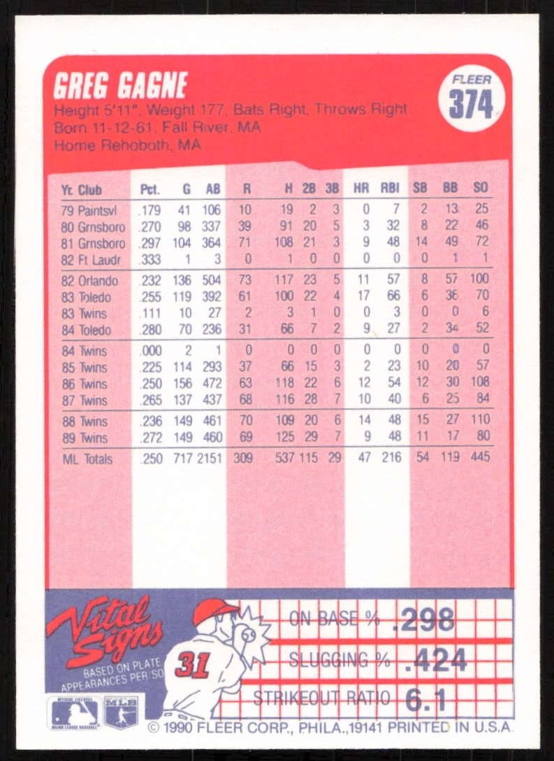 This Baseball card, from 1990 is part of the Fleer card set. Greg Gagne is featured and has a card number of 374.