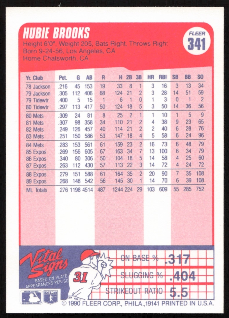 This Baseball card, from 1990 is part of the Fleer card set. Hubie Brooks is featured and has a card number of 341.