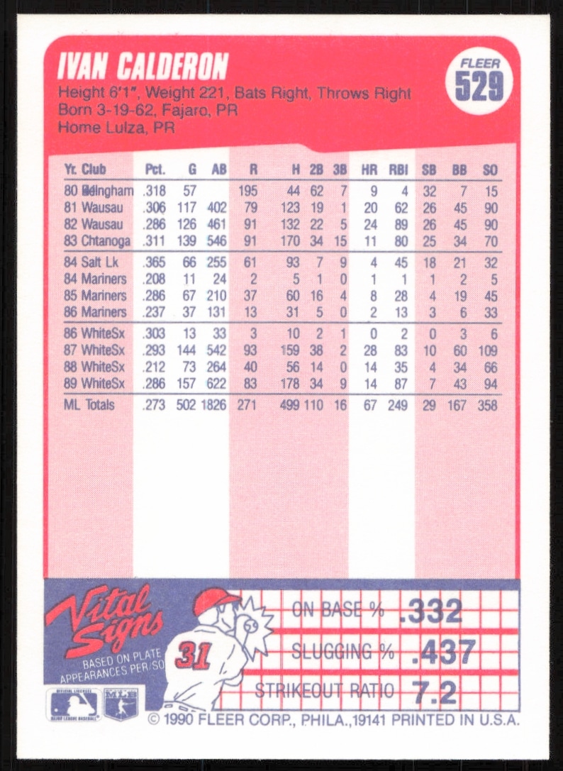 This Baseball card, from 1990 is part of the Fleer card set. Ivan Calderon is featured and has a card number of 529.