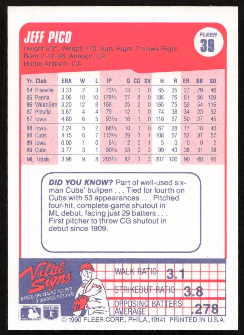 This Baseball card, from 1990 is part of the Fleer card set. Jeff Pico is featured and has a card number of 39.