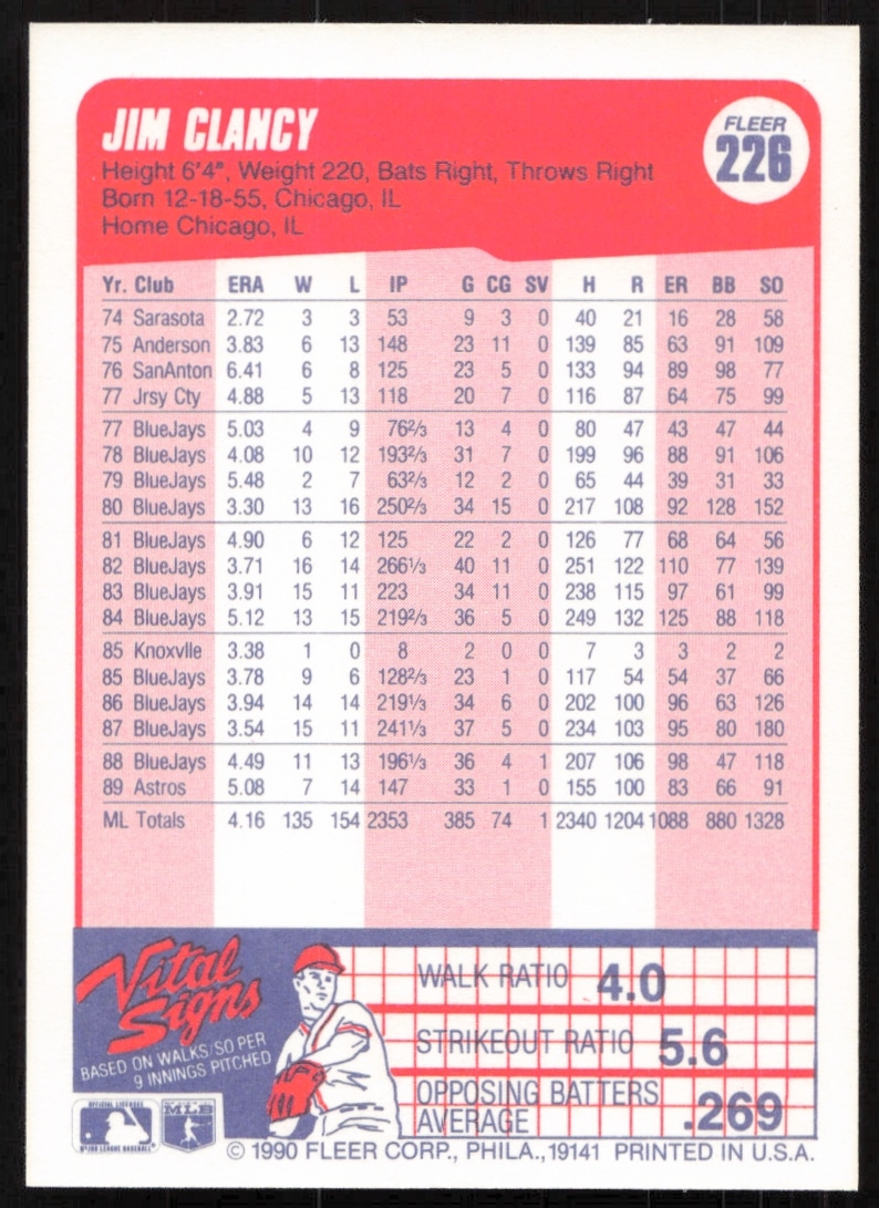 This Baseball card, from 1990 is part of the Fleer card set. Jim Clancy is featured and has a card number of 226.
