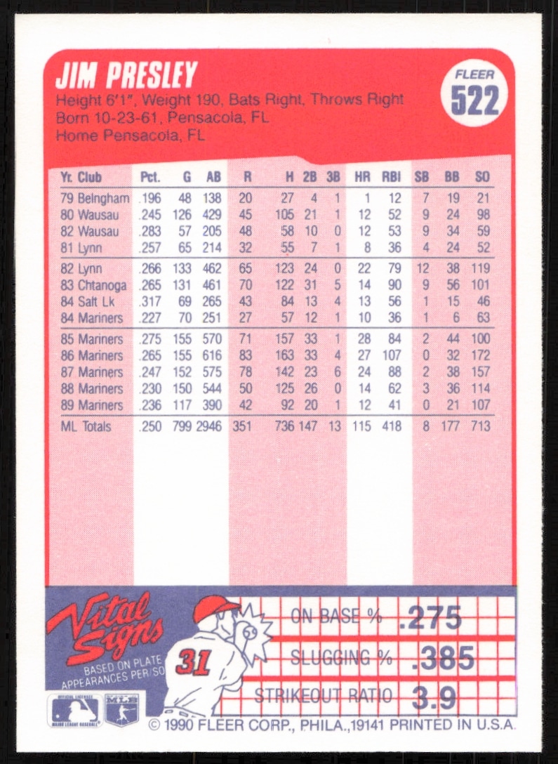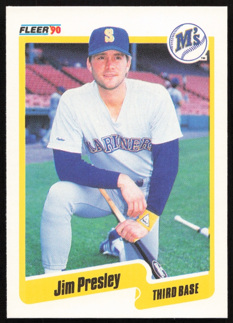 This Baseball card, from 1990 is part of the Fleer card set. Jim Presley is featured and has a card number of 522.