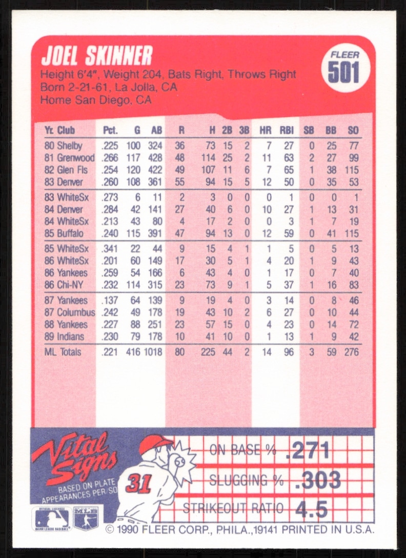 This Baseball card, from 1990 is part of the Fleer card set. Joel Skinner is featured and has a card number of 501.