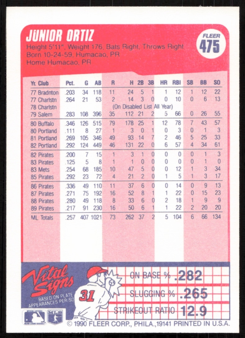 This Baseball card, from 1990 is part of the Fleer card set. Junior Ortiz is featured and has a card number of 475.