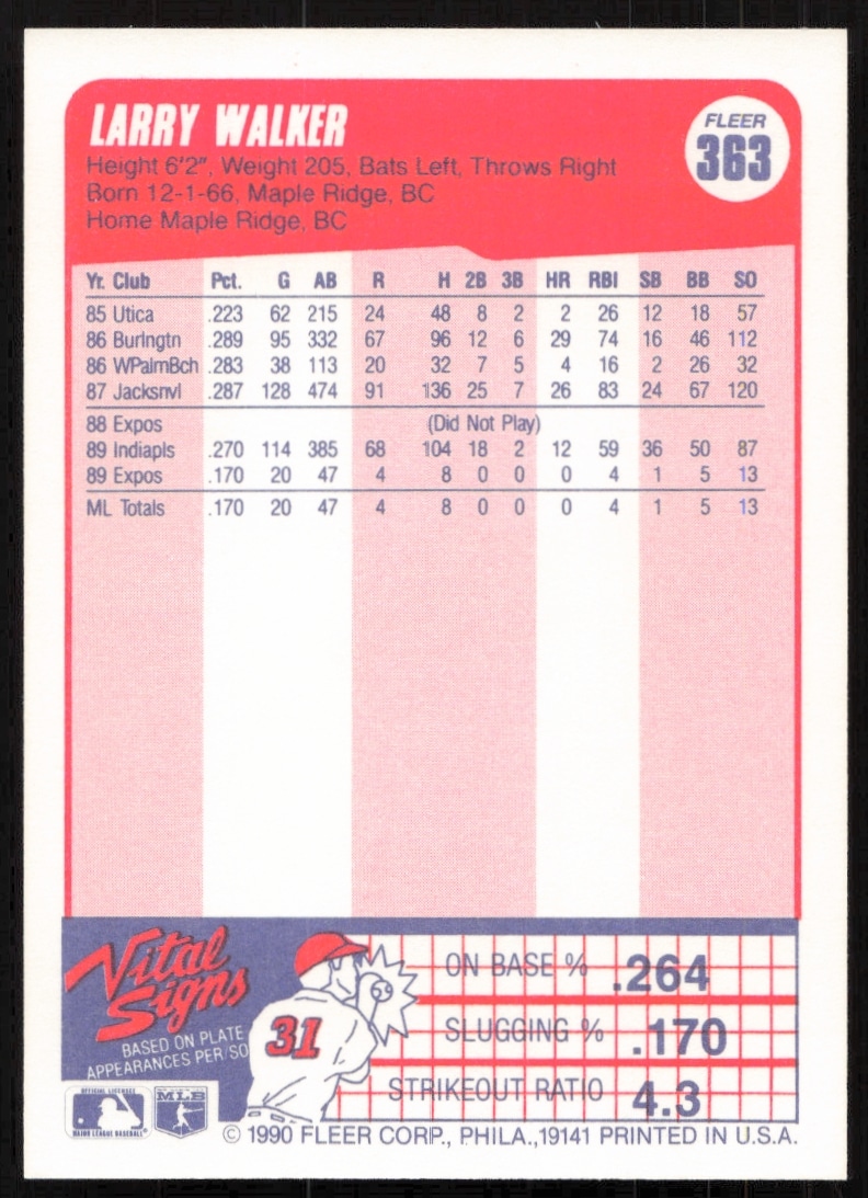 This Baseball card, from 1990 is part of the Fleer card set. Larry Walker is featured and has a card number of 363.