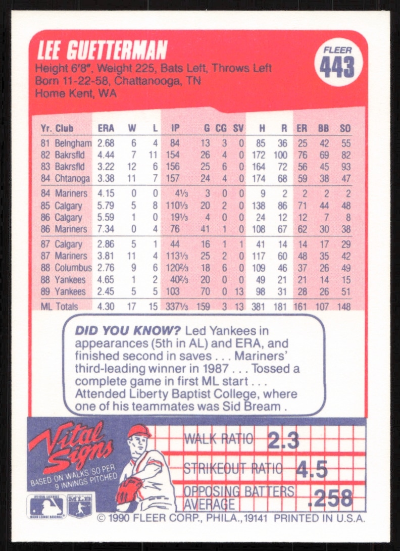 This Baseball card, from 1990 is part of the Fleer card set. Lee Guetterman is featured and has a card number of 443.