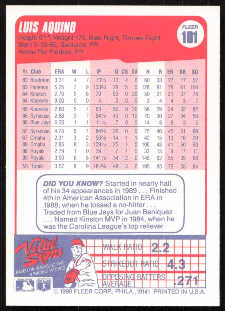 This Baseball card, from 1990 is part of the Fleer card set. Luis Aquino is featured and has a card number of 101.