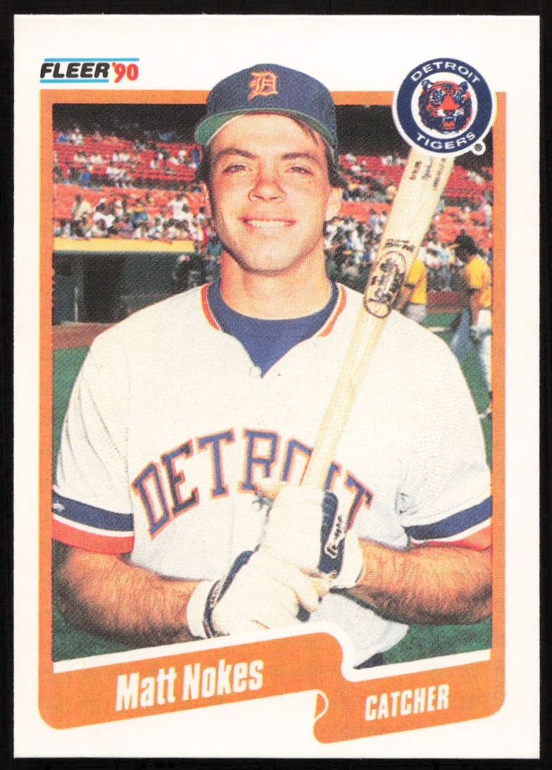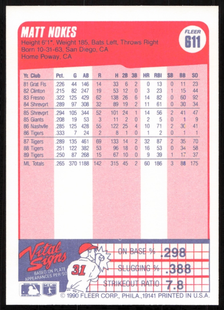 This Baseball card, from 1990 is part of the Fleer card set. Matt Nokes is featured and has a card number of 611.