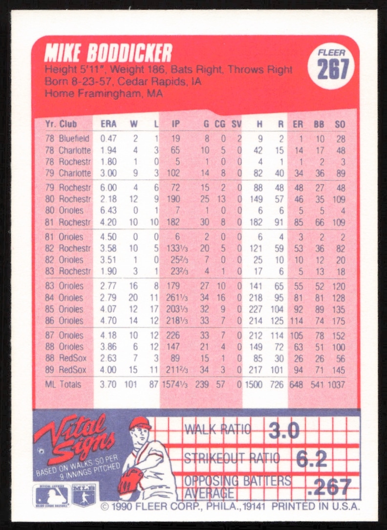 This Baseball card, from 1990 is part of the Fleer card set. Mike Boddicker is featured and has a card number of 267.