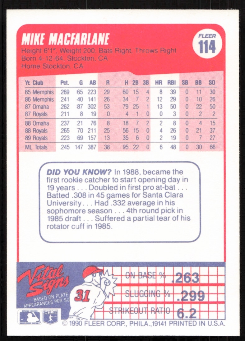 This Baseball card, from 1990 is part of the Fleer card set. Mike Macfarlane is featured and has a card number of 114.