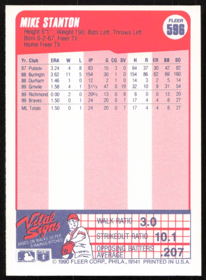 This Baseball card, from 1990 is part of the Fleer card set. Mike Stanton is featured and has a card number of 596.