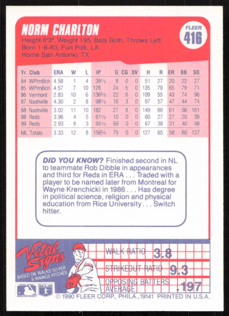 This Baseball card, from 1990 is part of the Fleer card set. Norm Charlton is featured and has a card number of 416.